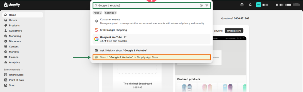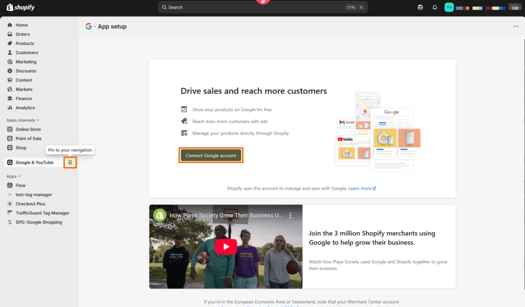 Shopify should take you directly to the Google & Youtube app after installation. If it doesn’t you can always search for it in the universal search at the top. In order to get back to the app easily make sure you pin it to the sidebar.