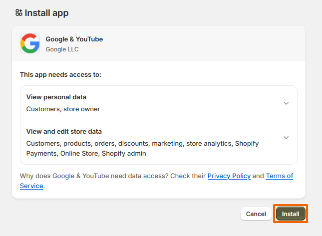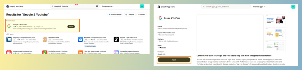 If you had to click search in Shopify app store you will see the Google & Youtube app at the top. Install the app: