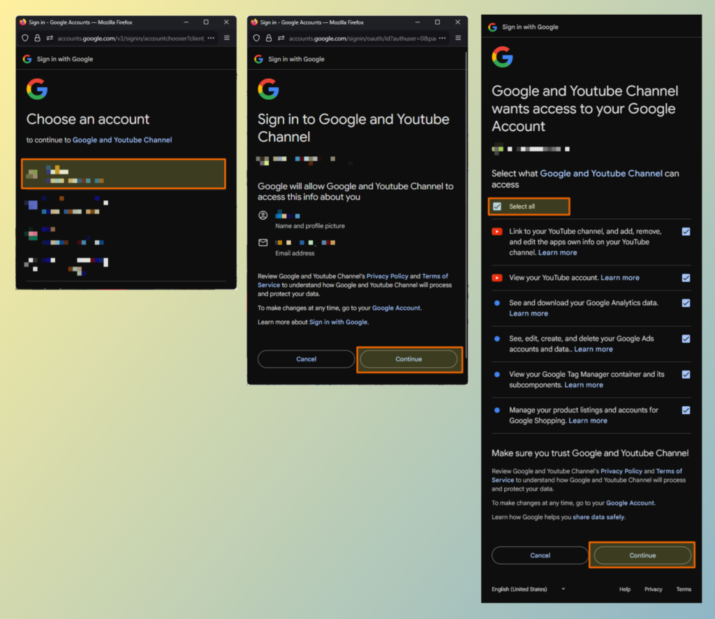 A popup will ask you to log in with Google. Select the account you want to use and click continue, then confirm to continue. On the final screen you will see a bunch of check boxes for different permissions, although they seem optional you need to select all of them. If you don’t select every checkbox it will ask you to go back and tick them.