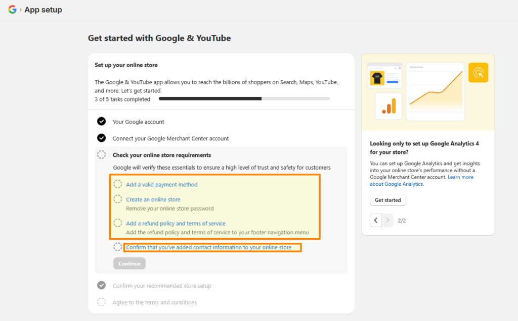 You will need to complete 3 basic requirements to complete the connection. You can click on each of them to go to the required location if you haven’t completed one. The final option “Confirm that you’ve added contact information to your online store” is not confirmed by Shopify, you will need to check this yourself, after which you click on the requirement and in the popup confirm you’ve completed it.
