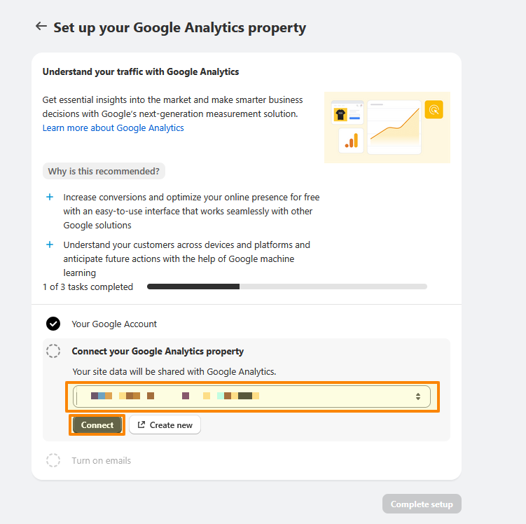 This is a breath of fresh air if you are coming from the Merchant Center setup, there’s very little to do here. Select the correct GA4 property from the dropdown and click connect:
